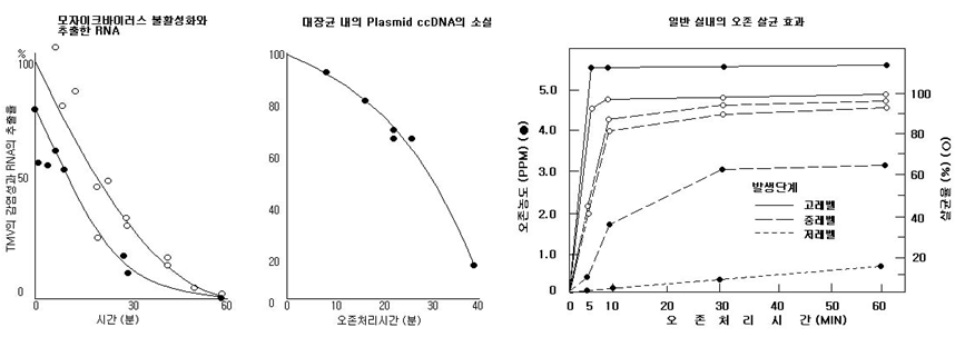 아래 그래프는 오존처리에 의한 대장균내의 Plasmid(염색체와는 따로 증식할 수 있는 유전인자) ccDNA의 소실에 관한 실험결과를 나타낸다.